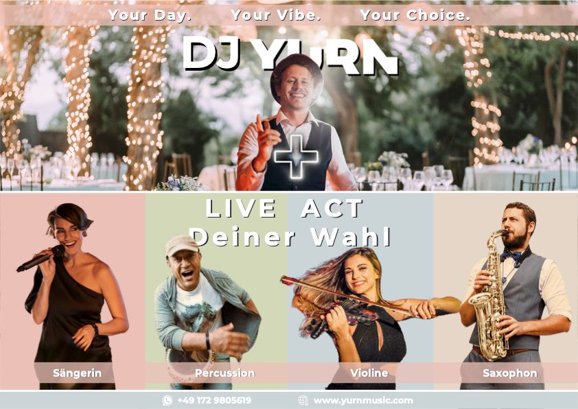 DJ Yurn + LIVE kombiniert das Beste aus zwei Welten: die Energie einer professionellen DJ-Performance und die Emotionen von Live-Musik. Egal ob beim Sektempfang, dem traditionellen Hochzeitswalzer oder der ausgelassenen Party am Abend – DJ Yurn + LIVE passt sich perfekt an jede Phase Ihres besonderen Tages an und sorgt dafür, dass die Stimmung immer auf dem Höhepunkt bleibt.